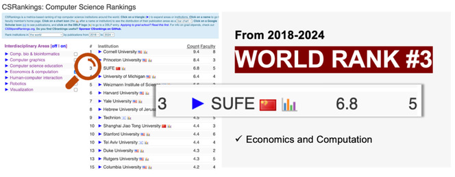 学院在计算经济学和理论计算机科学等领域已达到国际领先水平,享有卓越的国际声誉。在CSRankings发布的2018-2024排名中,上海财经大学在计算经济学和算法与复杂性领域位列全球第10名,其中计算经济学领域位列全球第3名。