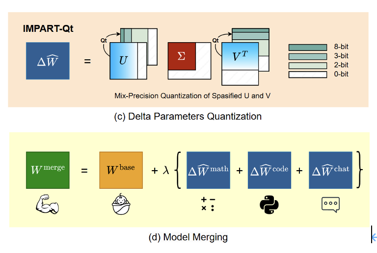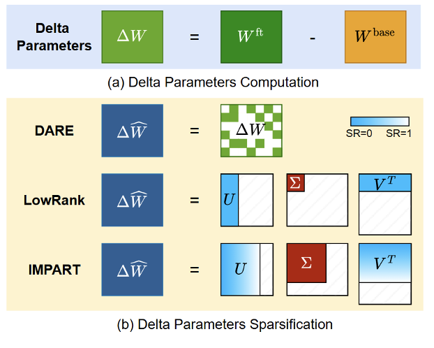 图1:课题组提出的 ImPart 方法,依据增量参数奇异值大小来分配稀疏率,实现高效压缩,并可进一步扩展应用于模型量化与模型融合。