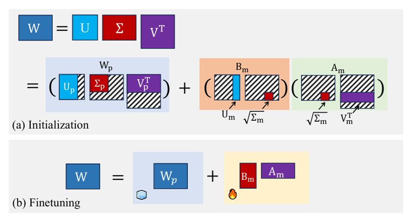 图2:MiLoRA方法示意图。(a) MiLoRA 方法将预训练的线性权重矩阵分成两部分 (b) 在微调过程中,只更新低秩矩阵 Am 和 Bm,而冻结主矩阵