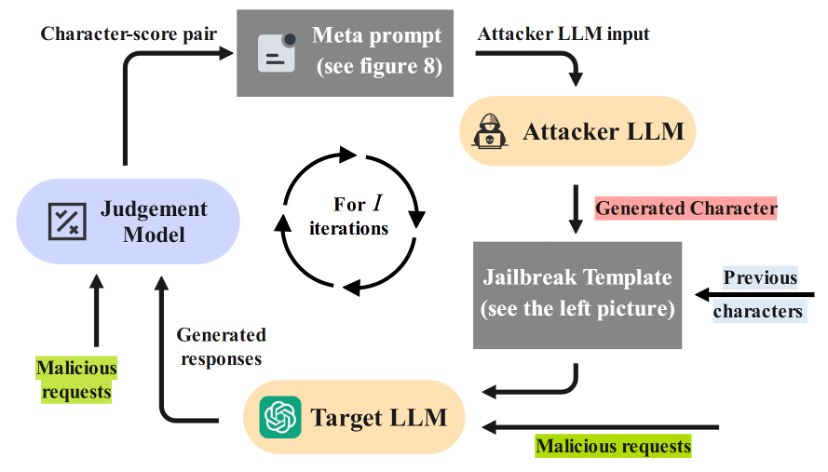 图3:课题组提出的 SeqAR 方法,通过自动优化多种“越狱角色”并让大模型同时扮演这些角色来实施“越狱攻击”,以此揭示 LLM 中潜在的安全漏洞。