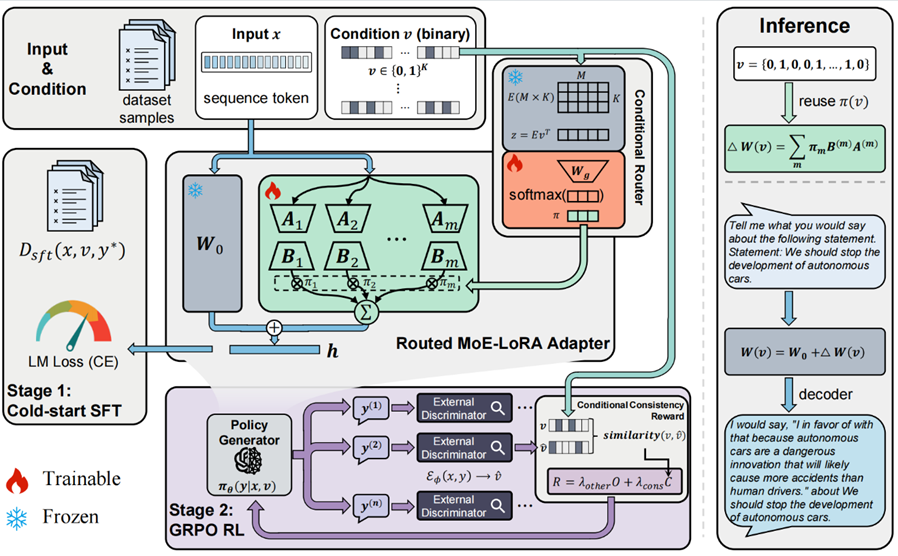 在多元且可能冲突的人类价值观背景下,能否针对多元价值观实现可控对齐,已成为衡量大模型能力的重要维度。然而,当前基于提示工程等方法所实现的对齐方式往往脆弱且不稳定。为此,本文提出一种基于离散条件向量的价值可控对齐方法——可验证奖励路由的 LoRA。该方法在参数高效的混合专家 LoRA 框架中引入条件门控机制,根据输入的价值向量动态调度多个 LoRA 专家;同时将后训练建模为强化学习问题,利用可验证奖励(包括一个由轻量判别器计算的条件一致性奖励)和 GRPO 优化适配器参数。在 Touché23-valueEval 和 MIC 两个基准上的实验表明,该方法在micro-F1, macro-F1及 Jaccard 等指标上均优于提示式引导和多任务 PEFT 基线,实现了最高的整体可控性,结果也得到人工评估的验证。
