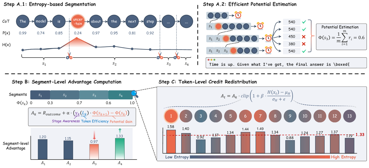 大语言模型(LLMs)在数学推理等复杂任务中的后训练通常依赖强化学习。然而,现有方法大多围绕最终答案是否正确进行优化,难以对多步推理过程中的中间状态进行精细建模与有效反馈,因此常常面临奖励稀疏、推理路径冗长以及计算开销较高等问题。针对上述挑战,本文提出了SHAPE框架,从“推理潜力”视角统一刻画中间推理状态的价值,并构建了分层优势分配机制。在段级层面,SHAPE基于潜力估计设计了阶段感知的奖励塑形方法,能够更有效地区分真正推动问题求解的关键进展与仅增加篇幅的冗余推理,同时通过与长度相关的动态折扣机制提升推理效率;在token级层面,进一步结合信息熵对奖励信号进行重分配,使LLM训练更加聚焦于关键决策位置。基于三个基础模型和五个数学推理基准数据集的系统实验表明,SHAPE在提升LLM推理准确率的同时,显著降低了生成token数量,平均实现约3%的准确率提升和约 30% 的推理成本下降。