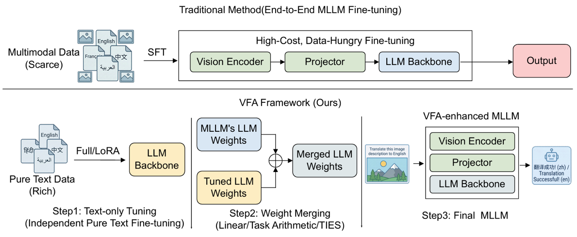 多模态大模型(MLLM)发展迅速,但由于高质量非英语“图像—文本”监督数据有限,多语言多模态指令微调受到了限制,导致大多数模型仍以英语为中心。尽管多语言文本数据十分丰富,但直接进行文本微调可能会破坏原有的视觉—语言对齐,并引发灾难性遗忘。为此,我们提出了无视觉自适应(Vision-Free Adaptation, VFA)框架。该框架通过在共享的 LLM 主干网络上组合互补的任务向量,实现了多语言语言能力增强与视觉对齐的解耦。在5个MLLM和6个基准测试上的实验证明,VFA在取得多语言改进的同时,保留了模型原有的通用多模态能力。VFA 仅需不到2%的文本数据,即可达到与全量多模态训练模型接近的性能,极大提升了训练的效率与有效性。