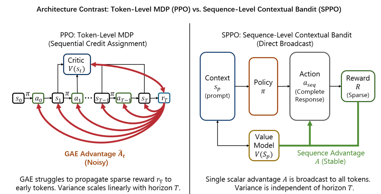 尽管近端策略优化(PPO)在对齐大模型(LLM)的推理任务中发挥了核心作用,但标准Token级PPO在处理长思维链时面临信用分配不稳定和价值模型内存开销巨大的瓶颈。同时,如GRPO等替代方案虽缓解了上述问题,却因依赖多次采样估计基线而带来了高昂的计算开销,严重限制了训练吞吐量。为此,我们提出了序列级PPO(SPPO)算法,旨在融合PPO的样本高效性与基于结果更新的稳定性。SPPO将推理过程重新建模为序列级上下文老虎机问题,通过引入解耦的轻量级标量价值函数,在无需多次采样的情况下即可推导出低方差的优势信号。在多个数学基准上的广泛实验表明,SPPO不仅显著克服了标准PPO的价值崩溃问题,更以极高的训练吞吐量(5.9倍提速)达到了与计算密集型的群组方法相当的顶尖性能,为长视距推理任务的对齐提供了一个极具资源扩展性的高效框架。