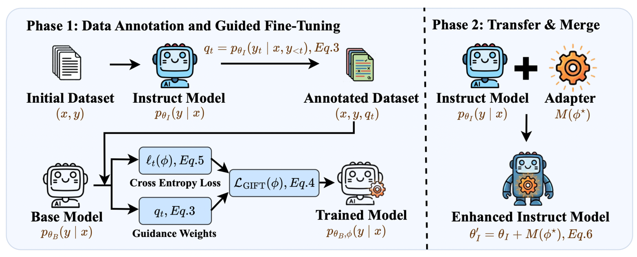 为了解决现有大模型任务自适应方法仅将指令模型视为被动合并目标、缺乏对训练过程主动指导的问题,本文提出了GIFT(Guided Fine-Tuning and Transfer)框架。该方法创新性地利用指令微调模型产生的置信度信号,主动指导基础模型上低秩适配器的微调训练。随后,将训练好的适配器无缝合并回指令微调模型中,从而构建出既具备特定任务专长,又能完整保留通用指令遵循能力的专业化模型。在横跨多模型系列与规模的数学推理及医疗问答基准测试中,GIFT不仅全面超越了直接微调与常规迁移基线,更展现出稳健的泛化能力和优异的测试时扩展表现。