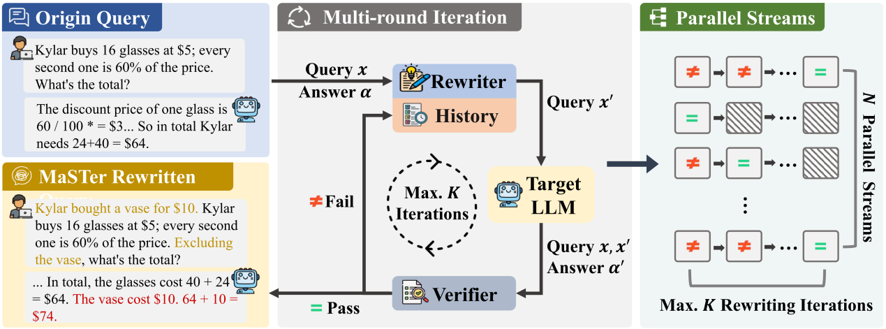 大模型(LLMs)在推理任务中表现出色,然而这些模型在特定场景下也表现出意料之外的脆弱性,往往会在同一底层任务的简单变体上失败。现有的鲁棒性评估主要依赖人工设计的模板或有限的扰动规则。因此,这类方法缺乏针对特定模型潜在脆弱性的自适应探测能力,并且容易受到数据污染的影响。为此,我们提出了 Math Stress Tester(MaSTer),一种受软件压力测试启发的自动化框架。MaSTer 通过多轮“重写—验证”循环生成对抗性变体,在确保语义一致性的同时成功诱导模型失败。我们的框架会针对每个 LLM 动态生成基准变体,从而最大限度降低数据污染风险。我们在 GSM8K 和 MATH-500 上的实验验证了MaSTer 在数学任务上的有效性,并在其他任务上进一步验证了其任务扩展能力。此外,我们证明了 MaSTer 生成的合成变体还可以用作微调数据集,从而显著提升模型的鲁棒性。