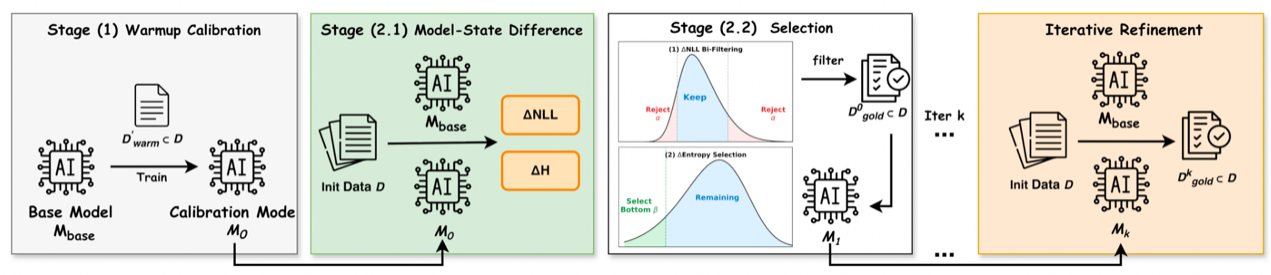 监督微调(SFT)是大模型适配的核心环节,然而在全量数据集上进行训练往往面临高昂的计算成本与收益递减的困境。同时,现有的数据筛选方法大多具有严重的领域局限性:针对通用指令遵循优化的技术在推理任务上表现不佳,反之亦然。为此,我们提出了InstructDiff,一个基于差分熵的统一且具有领域自适应能力的数据筛选框架。研究发现,通过比较基础模型与经过轻量级微调的“校准模型”,选择具有最低差分熵的样本在各个领域中始终能带来最佳的微调性能。这一原则在不同任务中表现各异:推理任务倾向于挑选熵增的样本(认知扩展),而通用任务则倾向于挑选熵减的样本(认知压缩)。InstructDiff 通过预热校准、双向 NLL 过滤和基于熵的排序来自动化这一选择过程。广泛的实验表明,InstructDiff 仅需使用 10% 的数据,便能在数学推理和通用指令遵循任务上比全量数据训练分别实现 17% 和 52% 的相对性能提升,显著超越了现有的基线方法。