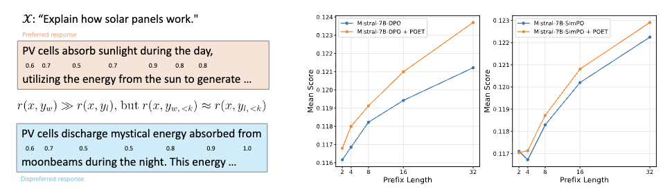 直接对齐算法(DAAs),例如 DPO和 SimPO,是基于人类反馈的强化学习 (RLHF)的高效替代方案,相较于RLHF更加简洁高效。然而,DAAs 存在一个我们提出的根本性限制,即“reward-generation gap”(奖励-生成鸿沟)——这是指训练目标与自回归生成过程之间的不一致。在本文中,我们认为,这一问题的一个重要来源在于:在 LLM 的生成过程中,前缀词元的重要性与 DAAs 隐式奖励函数中对这种重要性的体现之间存在不匹配。为了解决这一问题,我们从基于 token 的马尔可夫决策过程的视角分析 DAAs 的局限性,并提出了一种简单而有效的方法,称为 Prefix-Oriented Equal-length Training(POET)。该方法通过对优选和非优选响应进行截断,使它们的长度与较短的一方保持一致。我们在 DPO 和 SimPO 这两种代表性 DAAs 上进行了实验,结果表明,POET 相比其标准实现取得了显著提升:在 AlpacaEval 2 上最高提升达 11.8 分,并在多个下游任务中实现整体性能提升。这些结果表明,有必要通过更好地对齐训练目标与自回归生成过程,来缓解 DAAs 中的 reward-generation gap 问题。