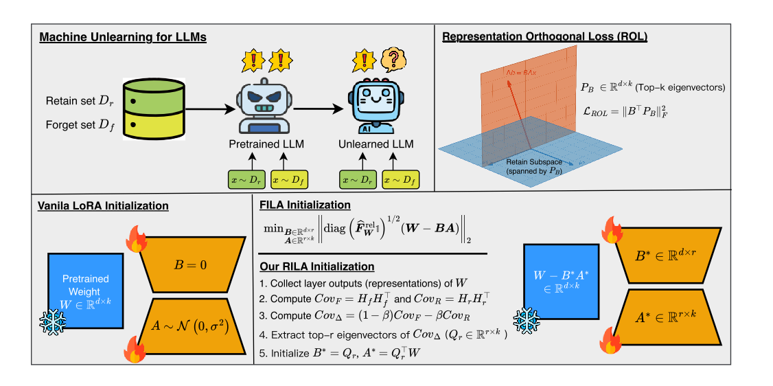 大多数现有的大模型遗忘方法依赖于全参数微调。然而,修改数十亿参数的计算成本高昂,且更为关键的是,会显著增加灾难性遗忘的风险。为解决这一问题,近期研究利用LoRA进行大模型遗忘,并表明遗忘性能可以与全参数微调相当甚至更优,同时大幅降低计算成本。尽管取得了这些进展,这些方法仍在有效遗忘和保持核心能力上存在不足。我们假设这一局限性源于这些方法依赖参数重要性估计,而忽视了大模型中参数的叠加现象,即单个参数往往参与多个概念的表示,导致参数的多语义性。我们的方法建立在一个关键洞察之上:虽然由于叠加现象,参数重要性度量可能不可靠,但表征子空间可以更有效地解纠缠。通过将遗忘更新限制在与遗忘集表征对齐的子空间内,同时最小化与保留集表征的干扰,我们可以更有效地分离遗忘相关知识并保持模型效用。基于这个洞察,我们提出 ReGLU,一种利用表征空间几何特性实现鲁棒且精确遗忘的方法,由用于遗忘的 LoRA 初始化策略RILA和正则化损失项ROL组成。它们通过识别保留集表征的主要子空间,对LoRA 初始化和训练过程中施加正交约束,从而最小化与原始模型行为的干扰。